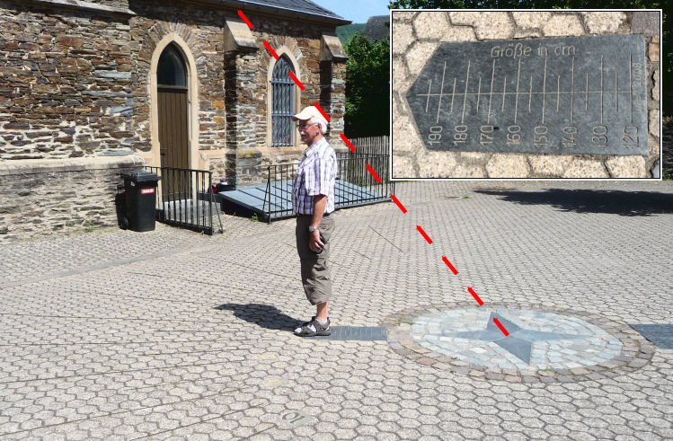 Spiegelzonnewijzer. Links het spiegeltje in de vensterbank, rechts de reflectie op de 12-uurs lijn. De datum is net na het begin van Boogschutter of tegen het einde van Steenbok (foto's: Reinhold Kriegler).