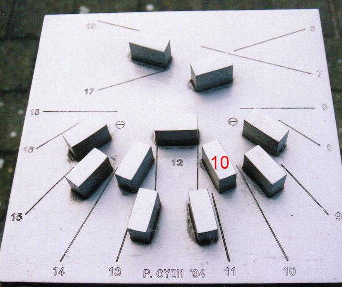 Uurvlakzonnewijzer. De schaduw van de rechter rand van blokje 10 (nummer toegevoegd op de foto) valt juist op de 10-uurs lijn.