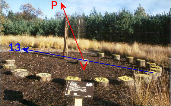 Koordzonnewijzer. Loop om de uurpunten en houd het koord strak. Als de schaduw van het koord op het voetpunt V van de (rode, virtuele) poolstijl P valt, valt hij ook op het uurpunt 13, dat op het verlengde van de (blauwe, virtuele) 13-uurs lijn ligt (Foto: Dees Verschuuren).