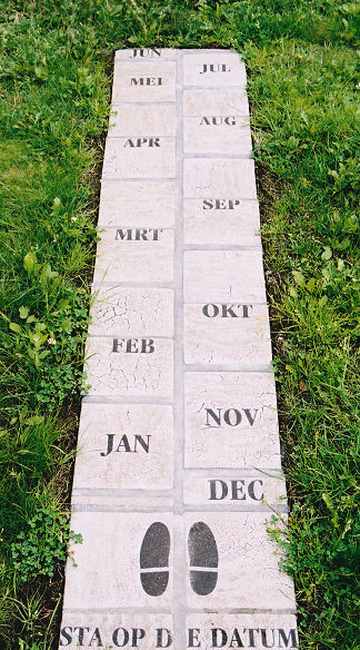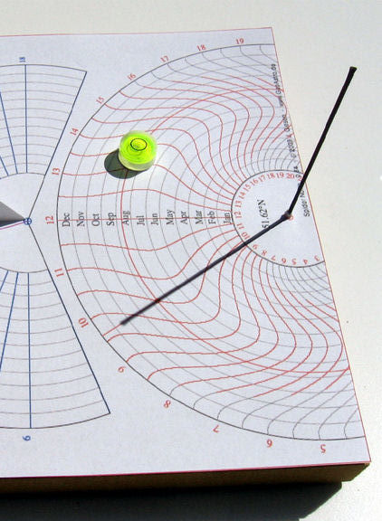 Spinzonnewijzer met uur- en halfuurs lijnen en datumlijnen per kalendermaand. Als de datum half oktober is, is het 10 uur (Jürgen Giesen).