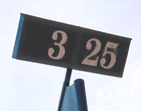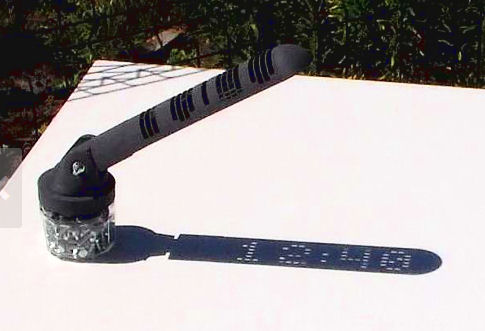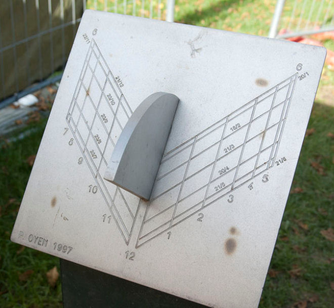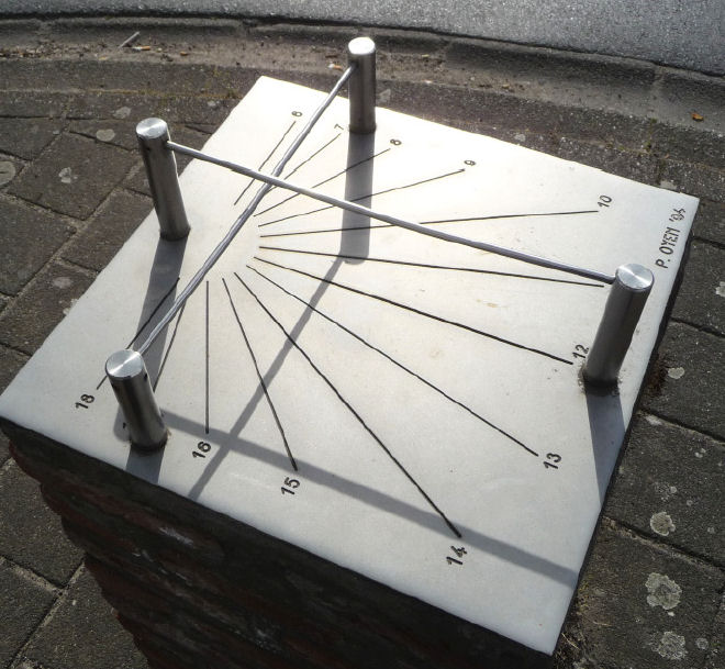 De zonnewijzer hieronder bestaat uit twee evenwijdige, polair geplaatste platen. In elk van beide is een bepaald patroon van spleetjes aangebracht. Afhankelijk van de richting van waaruit het zonlicht komt, valt het licht door verschillende combinaties van spleetjes, die aan de achterzijde gezien samen een cijfer vormen.