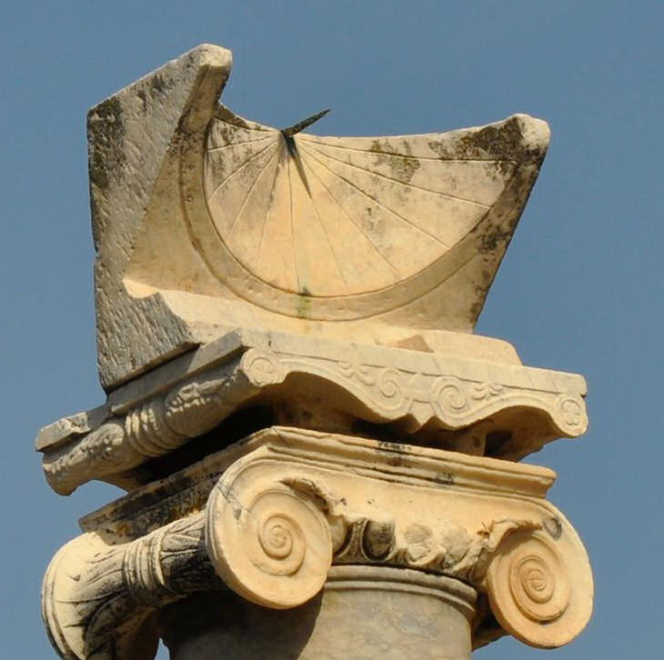 Een hemicyclium stond in de openbare ruimte vaak op een pilaar. Het wijst hier het einde van het zevende uur.