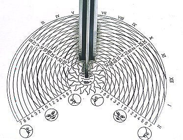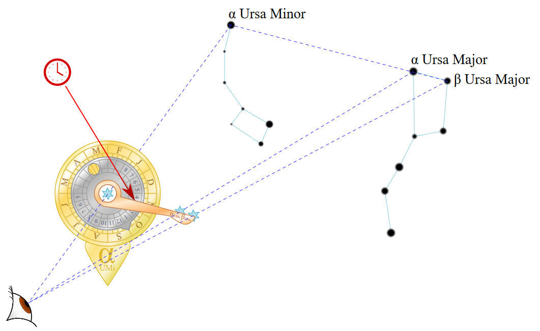 De binnenring van het nocturnaal wordt op de datum ingesteld. Je kijkt door het gat naar de Poolster en draait de arm naar de twee helderste sterren van de Grote Beer. De afgelezen tijd is 4 uur.