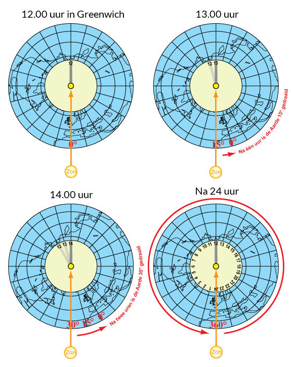 Hieronder ziet u vier opnamen van de camera, recht naar beneden genomen op vier tijdstippen. Hier is uitgegaan van een stilstaande zon en een draaiende aarde.