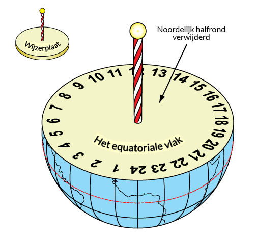 Het lijkt misschien wat vreemd om een zonnewijzer die we ons op de noordpool voorstellen een EQUATORIALE zonnewijzer te noemen. De reden is dat het vlak van de wijzerplaat evenwijdig is met het vlak van de evenaar of equator.