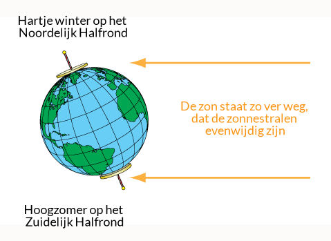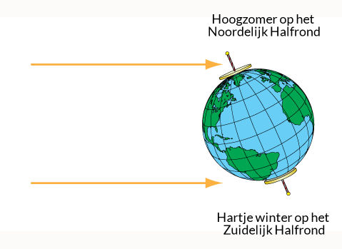 Als het zomer is op het Noordelijk Halfrond, is de aardas aan de noordpoolzijde naar de zon toegekeerd. Tussen april en september gaat de zon op de Noordpool niet onder en komt op de zuidpool niet boven de horizon.