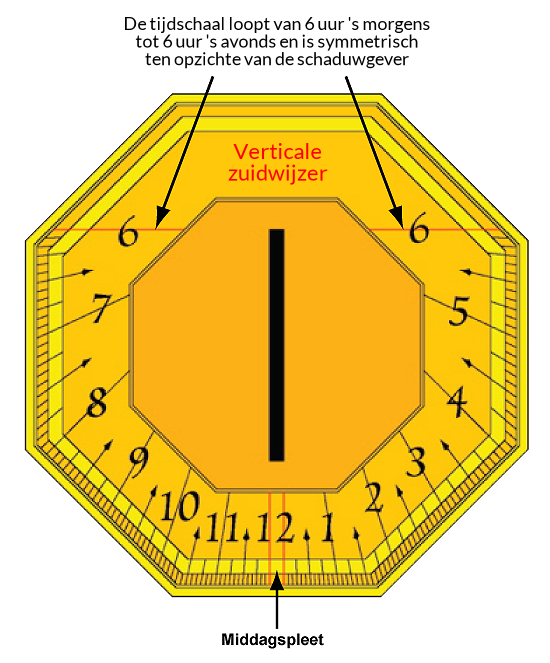 Een muur die precies oost-west loopt, 'kijkt' recht naar het zuiden. Zo'n muur wordt daarom een zuidmuur genoemd en de zonnewijzer een zuidwijzer. Op een zuidwijzer loopt de 12-uurslijn of middaglijn in het midden en liggen de andere uurlijnen daar symmetrisch omheen. De uurschaal loopt van 6 uur 's morgens tot 6 uur 's avonds.