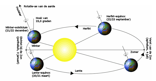 Op de equinoxen staat de aardas dwars op de richting aarde-zon. Dan is de afstand van de zon tot de aardas maximaal. Tijdens het zomersolstitium staat de noordkant van de aardas naar de zon toe geleund en is de afstand zon-aardas minimaal. Bij het wintersolstitium leunt de zuidzijde van de aardas naar de zon toe en is de afstand zon-aardas opnieuw minimaal.