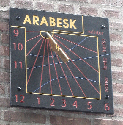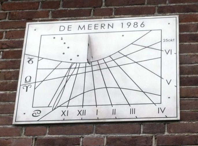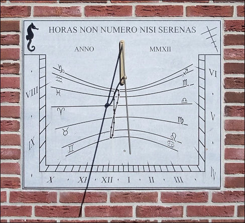 Iets west-afwijkende muurzonnewijzer. De lengtecorrectie is ingebouwd, want XII staat niet recht onder het voetpunt van de poolstijl. De tijdsvereffeningslus geeft 12 uur MET aan. Welk deel van de lus voor welk jaargetijde dient, is te zien aan de dierenriemtekens. De begindata van de kalendermaanden zijn op de lus met een stip aangegeven.