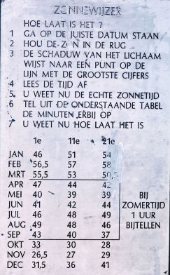 Tabel bij een analemmatische zonnewijzer geeft de correcties voor tijdsvereffening, lengtecorrectie en zomertijd. De zomertijd gold indertijd tot eind september.